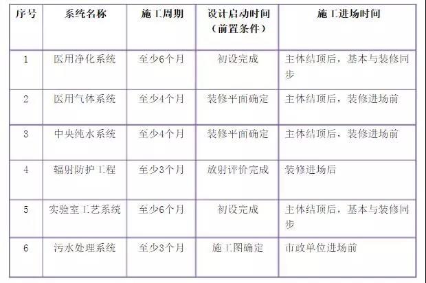 由于專項系統在設計階段、實施階段、收尾階段都起著承上啟下的作用,一旦在設計、施工進場時間考慮不周全,會對裝修、總包調試等工作造成極大影響,根據以往類似醫院項目建設管理經驗總結,提出了系統設計及進場時間節點要求,以供專項系統規劃設計和招標采購、施工進場等階段的管理工作參考
