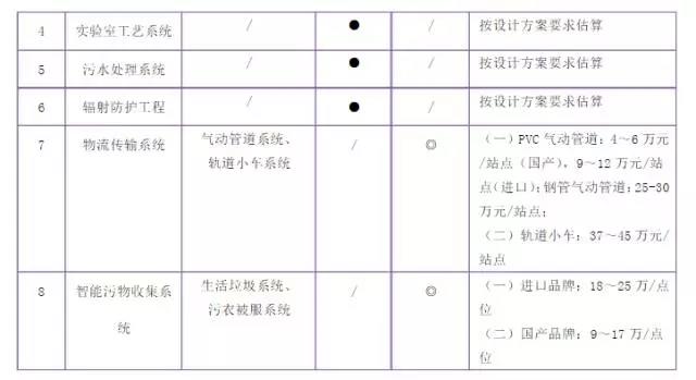 1 凈化系統 通過凈化工藝處理,對空氣、溫度、濕度、壓差、細菌、照度等進行控制,使Ⅰ類、Ⅱ類及Ⅲ類診療場所滿足空氣凈化技術要求,也是醫院最核心的專項系統之一。 2 氣體系統 用于麻醉、治療、診斷或預防用途,作用于病人或醫療器械的單一或混合成份氣體,也是醫院最常見的專項系統之一。 3 中央純水系統 用一套制水機對原水進行深度處理,包括預處理、反滲透、EDI深度除鹽、后處理、循環供水等工藝,實現集中制水、分質供水的模式,再分別用管網供給各科室使用。 4 實驗室工藝系統 通過防護屏障和管理措施,達到各種安全要求的實驗室,包含進行相應試驗相關的一系列儀器、物類、人員,是一個系統集成,用于各類生物化驗、化學試驗、物理試驗等功能。 5 污水處理系統 通過污水處理系統,對醫療機構污水、污水處理站產生的廢氣、污泥進行工藝處理機消毒,實現醫院污水處理達標排放。 6 輻射防護工程 在X射線、核醫學、放射等電離輻射源和受其照射的區域內,采用能減弱輻射的材料來降低此區域內的輻射防護和電磁屏蔽,以此保護人體安全和減少對設備的干擾。 7 物流傳輸系統 通過物流傳輸系統在醫院內部各科室之間快速傳輸如衣物、藥品、化驗室樣本、血液、病歷卡等,減少人力傳輸成本。 8 智能污物收集系統 主要用于醫院產生醫療廢物、生活垃圾及污衣被服等污物收集,實現了全封閉、快速、清潔,節省了大量人工成本,同時避免了更多的交叉感染。 系統功能覆蓋區域