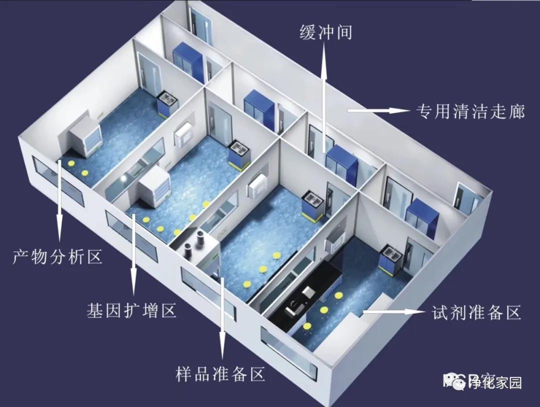 1、溫濕度 冬季18-24℃,夏季25-28℃,濕度40-70%。 2、空氣過濾及氣流組織要求 新風經熱濕處理及三級(初效+中效+高效/亞高效)過濾后送入室內;各房間排風口單獨設置高效或亞高效過濾器。 當房間無工藝設備排風時,可通過換氣次數(工藝操作間換氣次數為12~15次/h,緩沖間6~8次/h)計算得出房間送風量,然后根據縫隙法得出房間排風量;當房間有工藝設備(如生物安全柜)排風時,比較設備排風量與滿足換氣次數所需送風量,取兩者之間的較大值(一般情況下,設備排風量較大),然后可根據縫隙法得出房間送風量。根據以上計算風量為設計依據,由此可對新風機組、排風機組及附屬的風管風口進行選型和計算。 氣流組織上,PCR實驗室空調系統通常采用上送下排式的非單向流送風方式。房間上部送風口盡量均勻布置,且與生物安全柜操作面或其他有氣溶膠操作地點的正上方保持一定距離;房間下部利用室內排風夾道上設置的排風口排風,排風口底部距地面0.1m,排風夾道需設置于室內被污染風險最高的區域,排風口前面不應有障礙物遮擋。