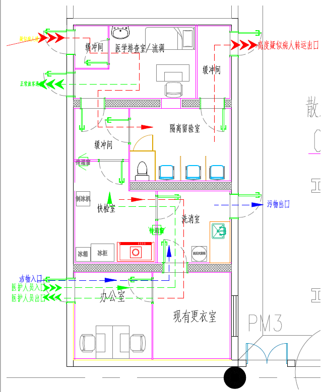(3) 污染區:快檢室、洗消室、醫學排查室/流調、隔離留驗室。